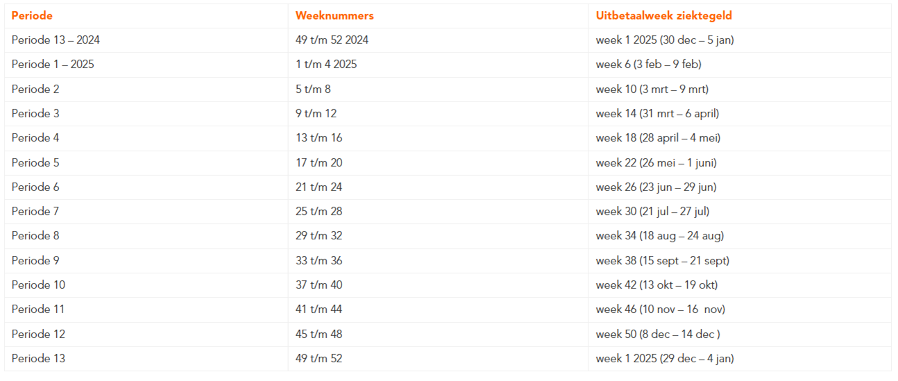 Please note: de ziekte-uitkeringen vinden 1 keer per vier weken op maandag plaats. Afhankelijk van jouw bank ontvang je deze betaling op maandag of dinsdag. Dit geldt ook als er afwijkende afspraken zijn gemaakt voor periodieke loonbetalingen. De uitbetaling van deze uitkering vindt altijd plaats 2 weken na einde van de periode. Concreet betekent dit dat week 1 t/m week 4 in week 6 wordt overgemaakt, enzovoort.