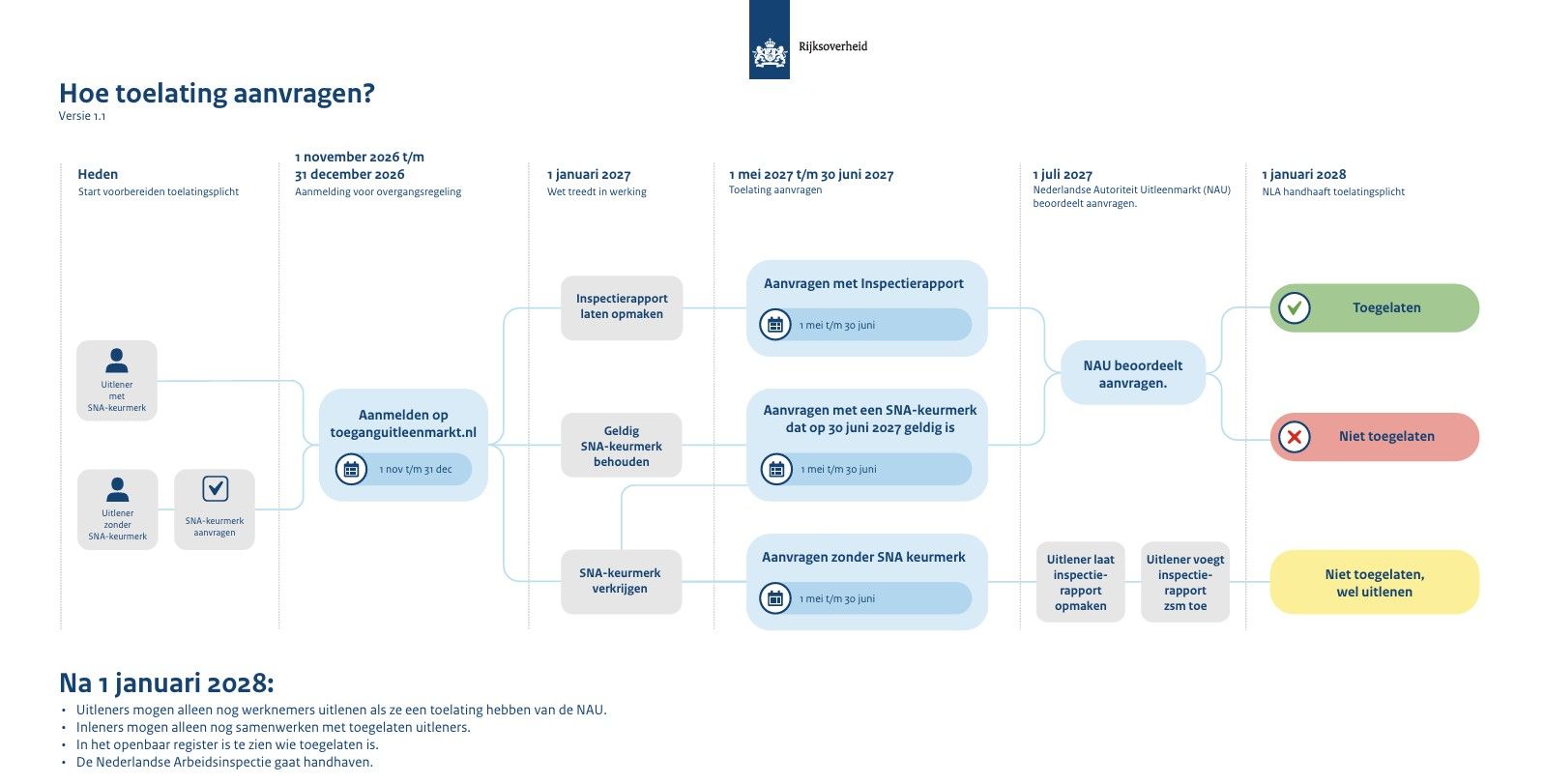 Op 1 januari 2027 gaat de wet in. Bedrijven die werknemers willen blijven uitlenen, moeten zich vóór die datum bij de Nederlandse Autoriteit Uitleenmarkt (NAU) melden. Dit is een onderdeel van het Ministerie van Sociale Zaken en Werkgelegenheid.