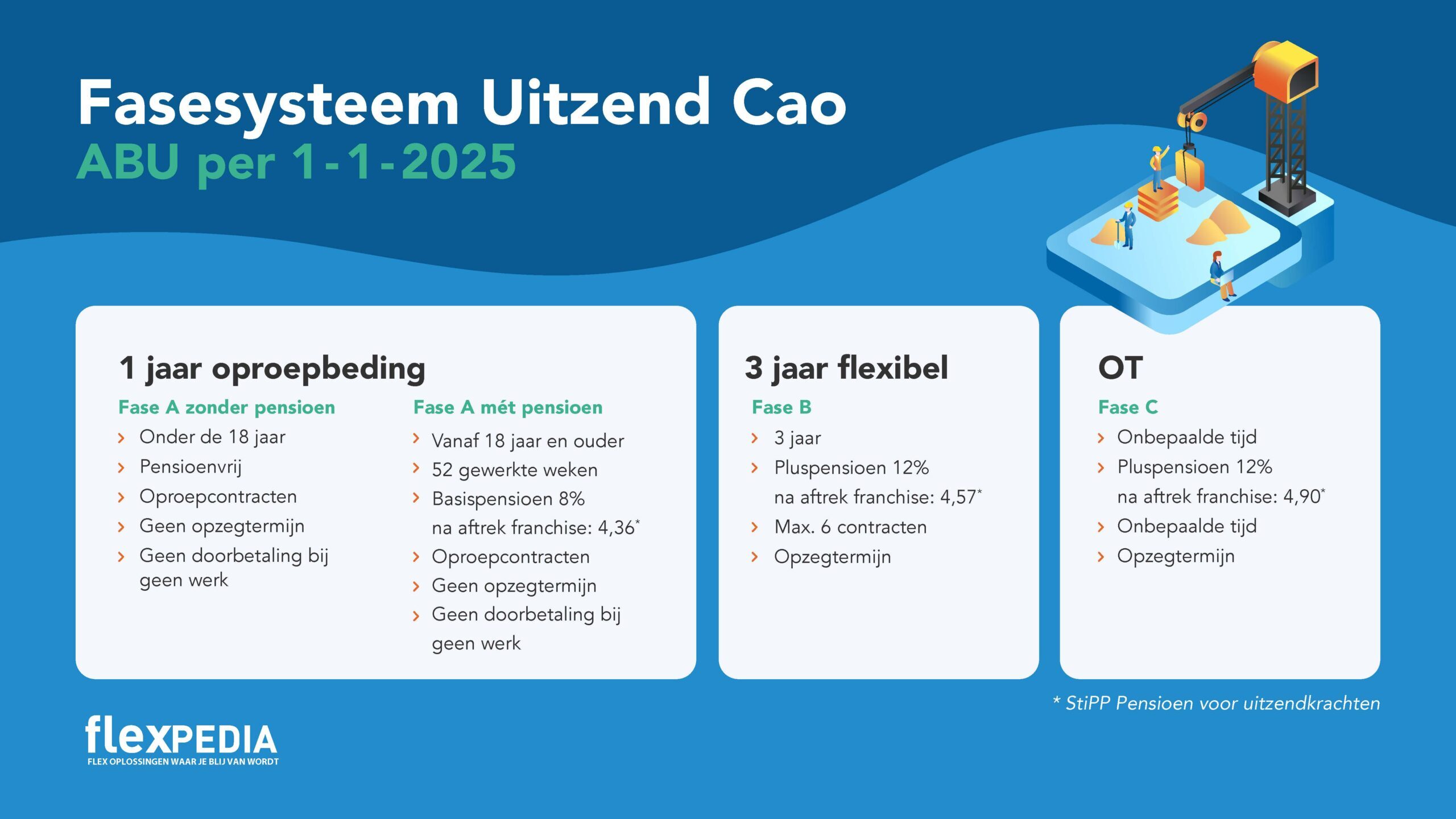 Na 52 gewerkte weken, komt hij of zij in Fase B (fase 3) inclusief StiPP Pluspensioen. Vervolgens, na 3 jaar Fase B of 6 contracten van bepaalde tijd binnen 3 jaar, gaat de uitzendkracht naar Fase C (fase 4) inclusief StiPP Pluspensioen.