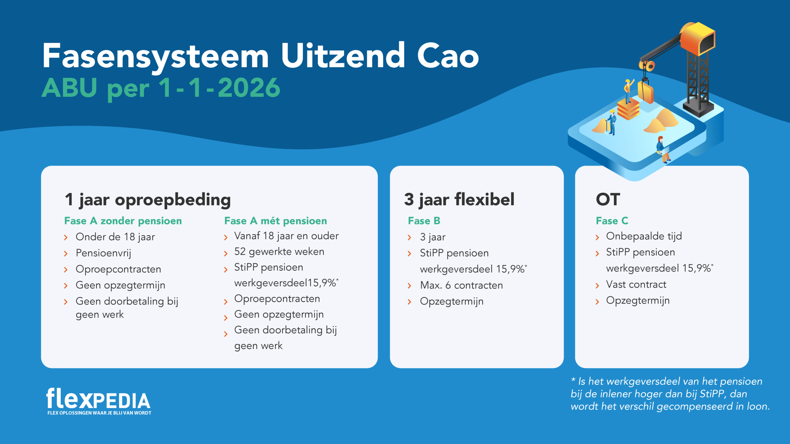 Na 52 gewerkte weken, komt hij of zij in Fase B (fase 3) inclusief StiPP Pluspensioen. Vervolgens, na 3 jaar Fase B of 6 contracten van bepaalde tijd binnen 3 jaar, gaat de uitzendkracht naar Fase C (fase 4) inclusief StiPP Pluspensioen.